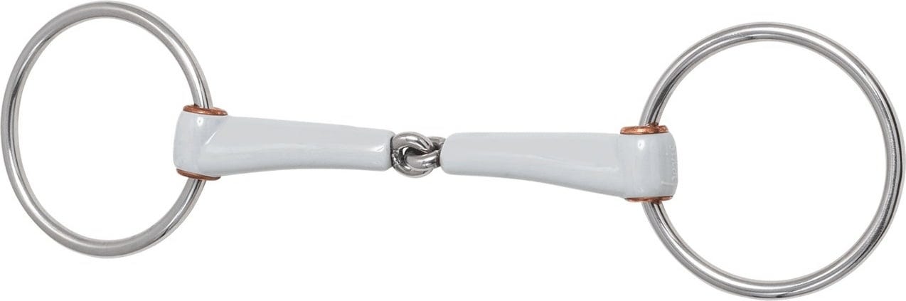 Ge din häst möjlighet till avslappnad tuggaktivitet med detta särskilt platt designade munstycke, som inte trycker även i trånga munnar. De mjukt utformade övergångarna till sidostyckena förhindrar att mungiporna kläms och skapar en stabil och behaglig känsla i munnen. Tack vare de integrerade kopparbussningarna glider ringarna nästan helt friktionsfritt, vilket ger dig möjlighet till exakta och mjuka hjälper. Det högkvalitativa, livsmedelssäkra plastmaterialet känns behagligt för hästen och främjar en tillitsfull kontakt i alla utbildningsfaser.