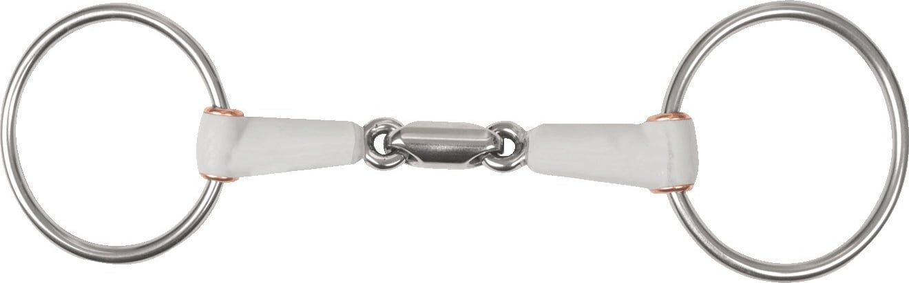 Extra fina signaler förmedlas effektivt med detta dubbelt ledade tränsbett, som tack vare sin smala form anpassar sig optimalt till din hästs anatomi. De breda anläggningsytorna fördelar trycket jämnt över tunga och laner, vilket ger en tydligt ökad komfort. Integrerade kopparbussningar säkerställer att ringarna glider tyst och mjukt. Munstycket är tillverkat i extremt slät, livsmedelssäker plast som stimulerar salivproduktionen samtidigt som det skyddar mungiporna mot skav.