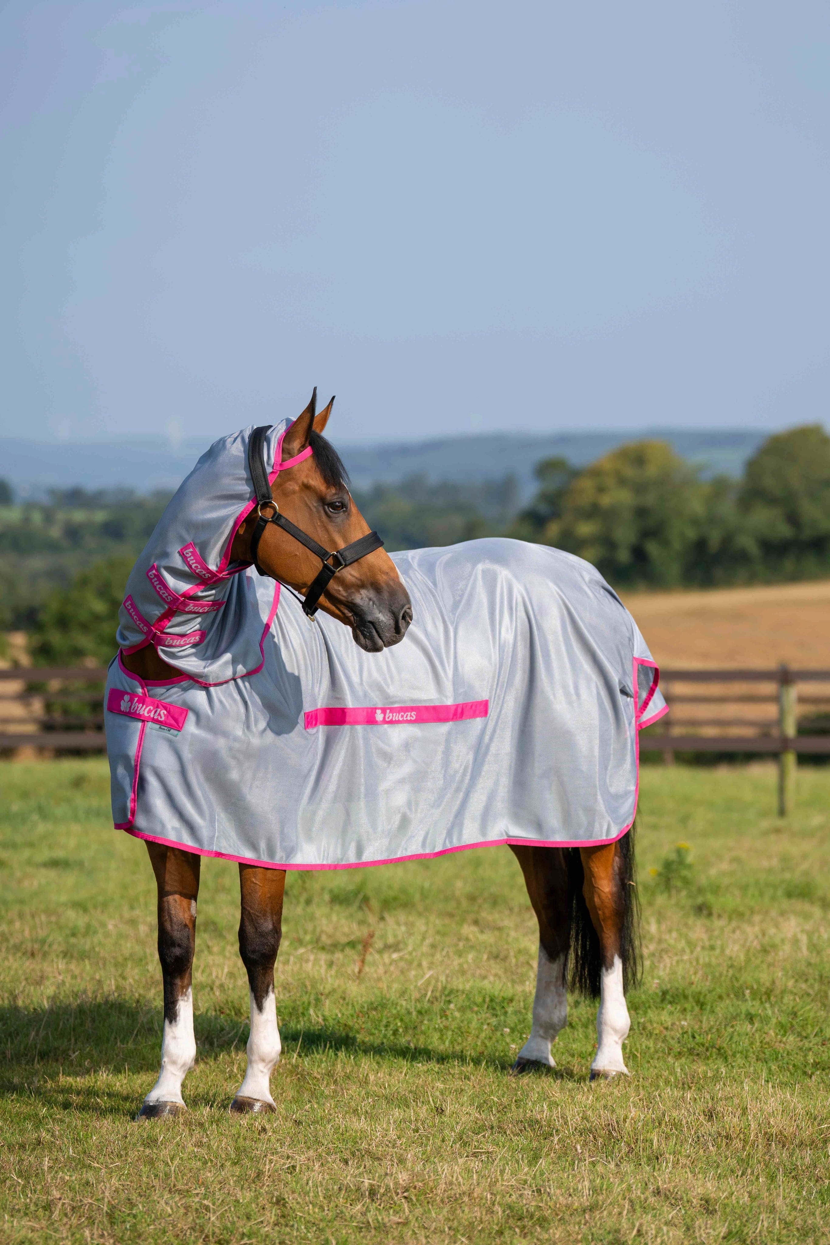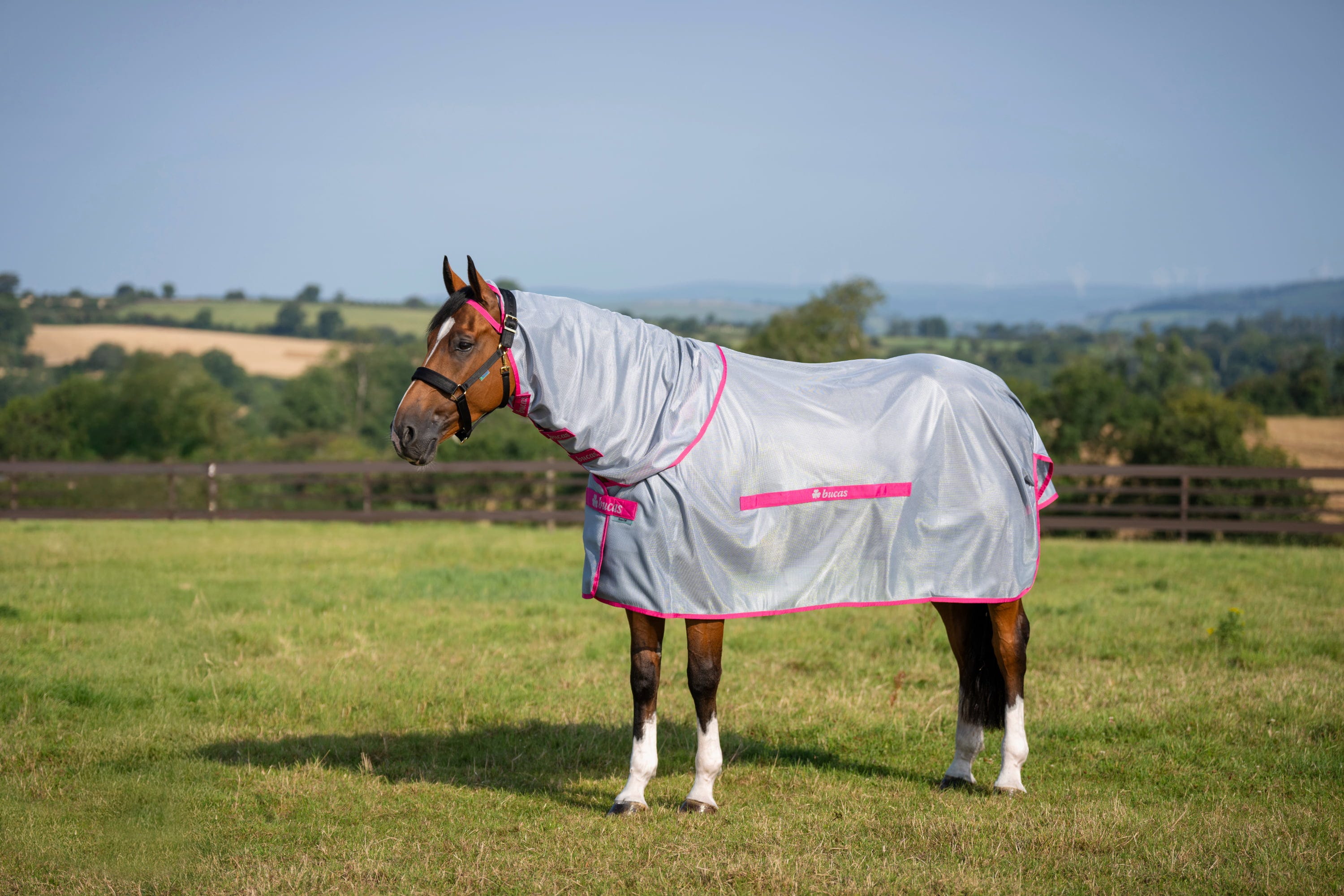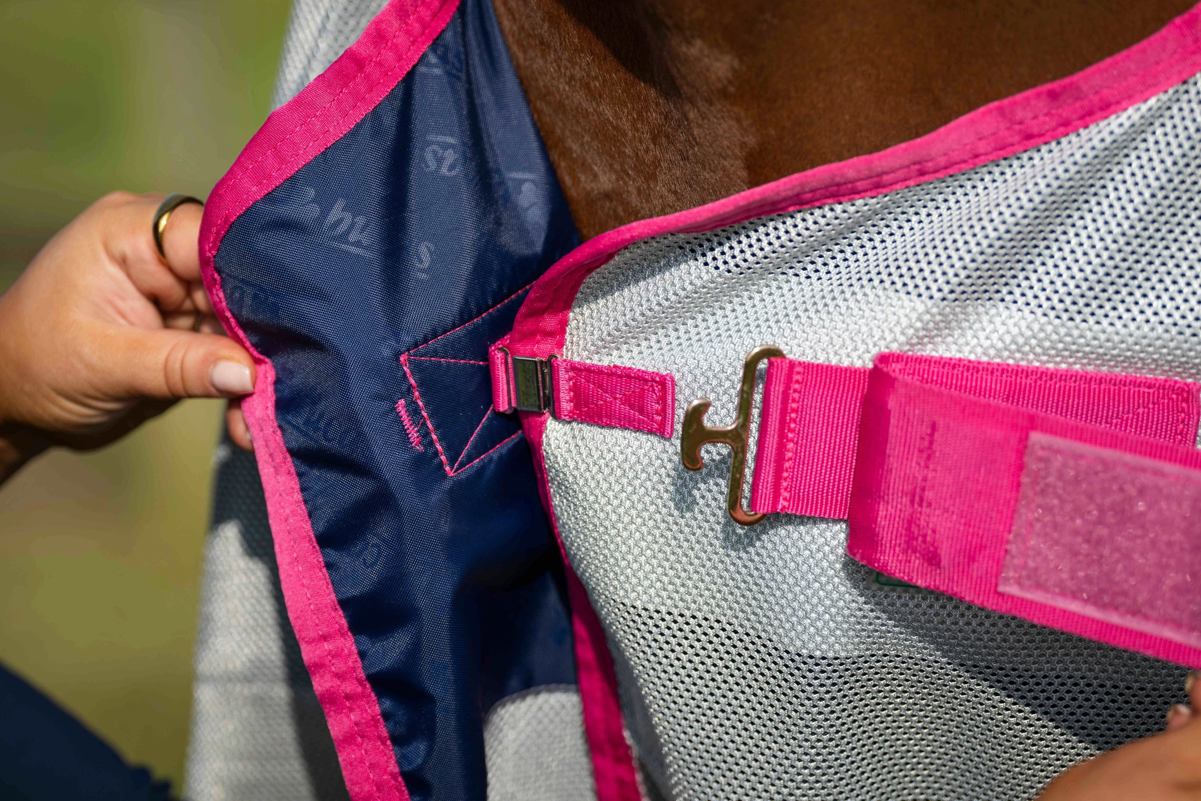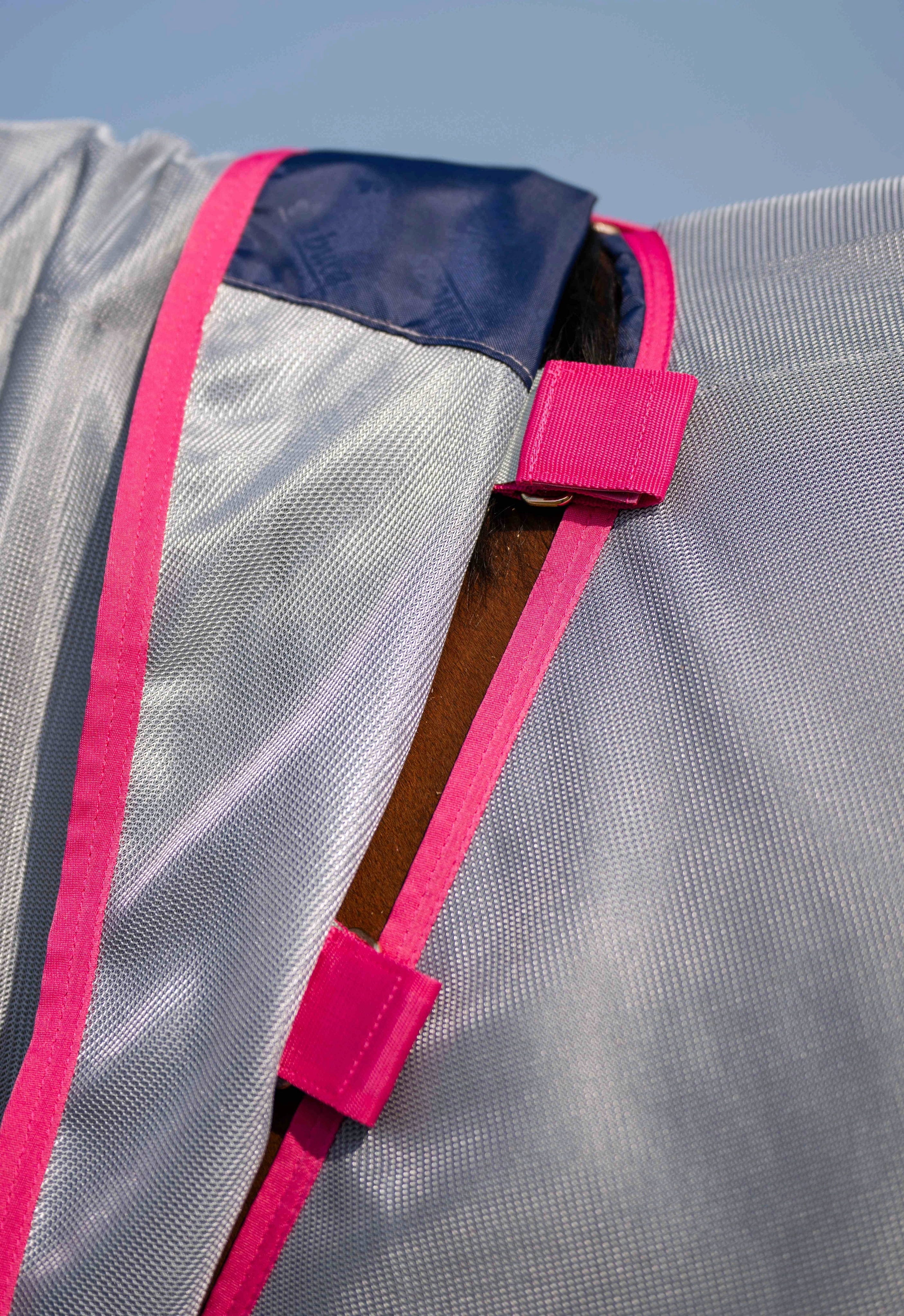 Det innovativa och extra finmaskiga materialet är särskilt utvecklat för att stoppa även de minsta insekterna från att nå huden, samtidigt som den moderna rosa designen ger en stilren och uppseendeväckande look. En särskild egenskap hos denna modell är den integrerade halsdelen som omsluter den känsliga halsen upp till öronen och ger ett heltäckande skydd. Tack vare materialets reflekterande egenskaper minskas även stark UV-strålning, vilket bidrar till att förebygga hudirritation och håller hästen sval under täcket.