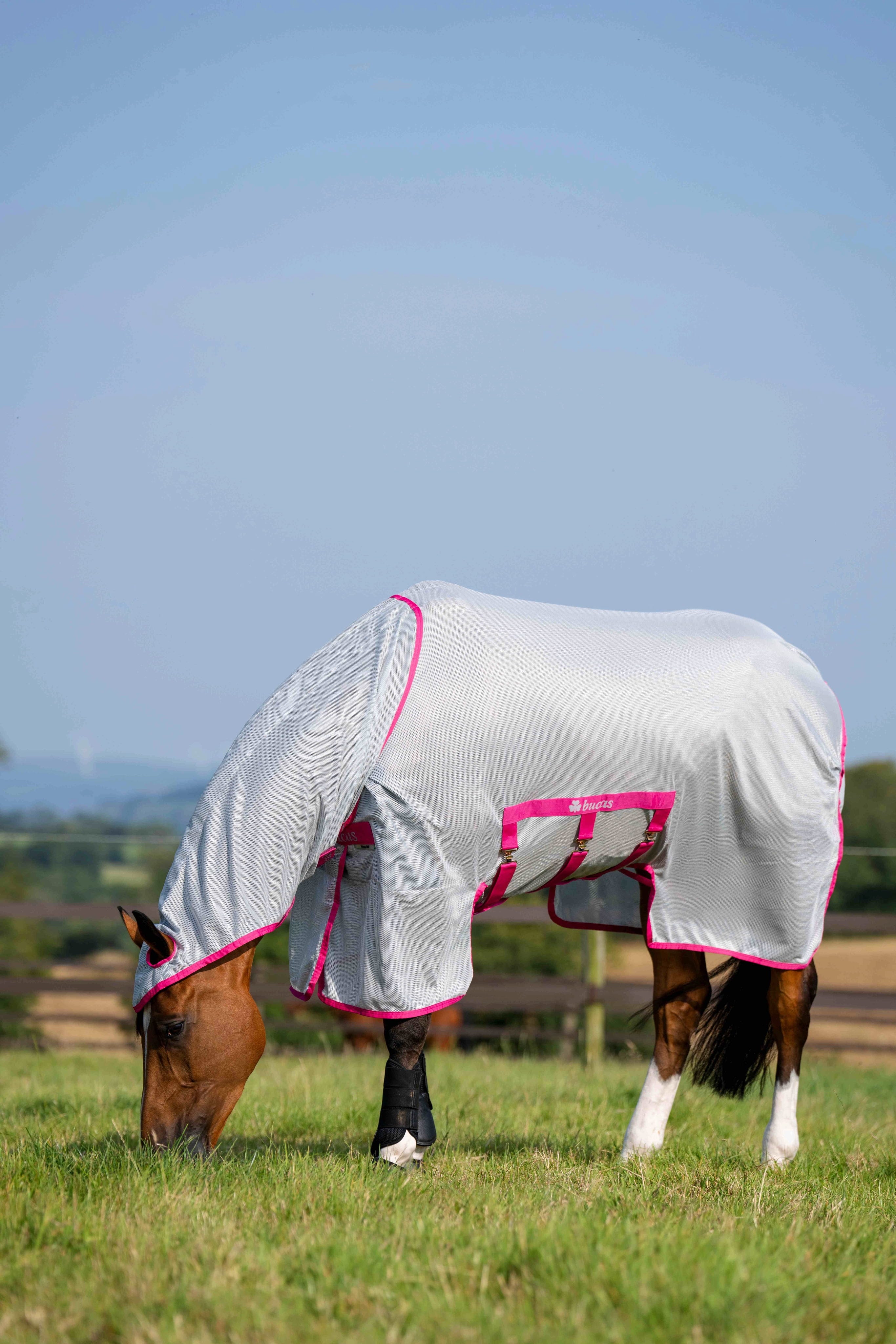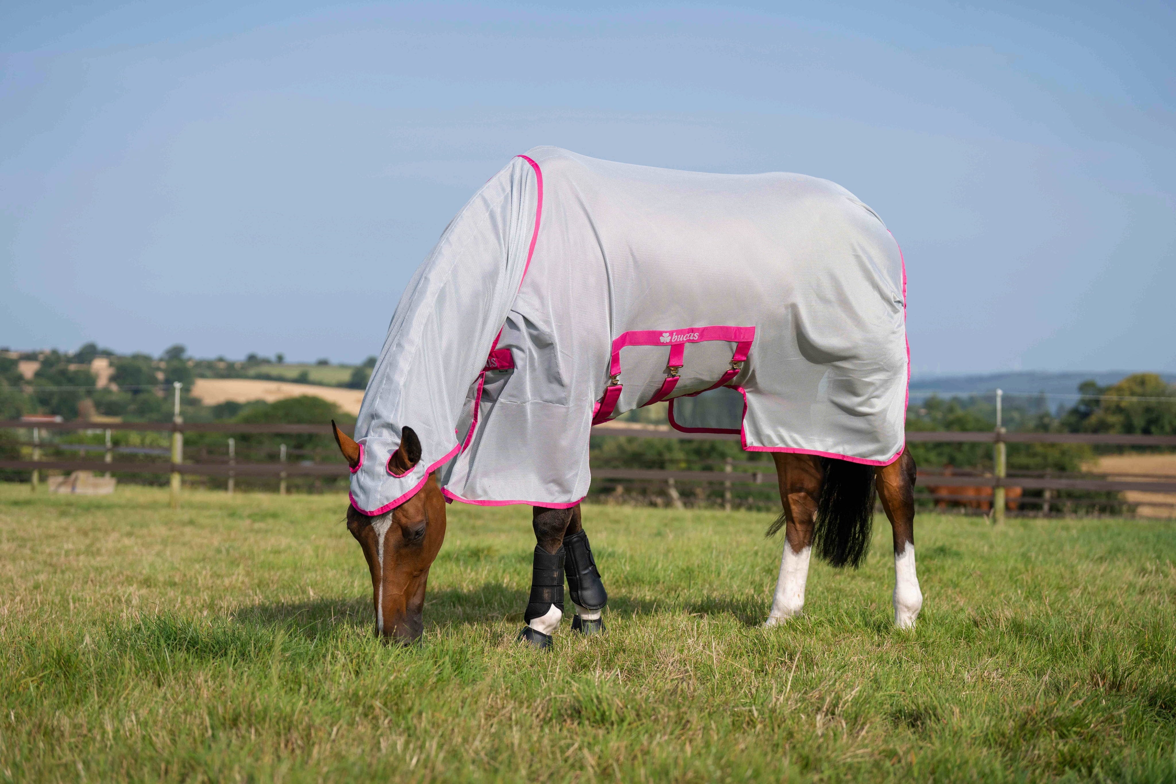 Bucas Buzz-Off X i den moderna färgkombinationen Blue/Blossom är det perfekta valet för din häst om du vill ha maximalt skydd mot insekter. Det som utmärker denna X-variant är den extra djupa skärningen på sidorna, som sträcker sig långt över magen och effektivt skyddar även den övre delen av benen mot irriterande stick.