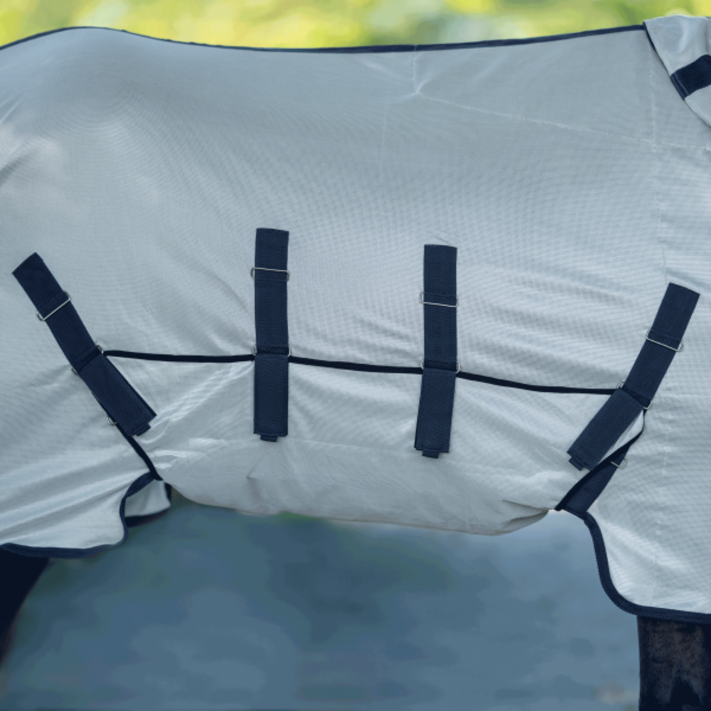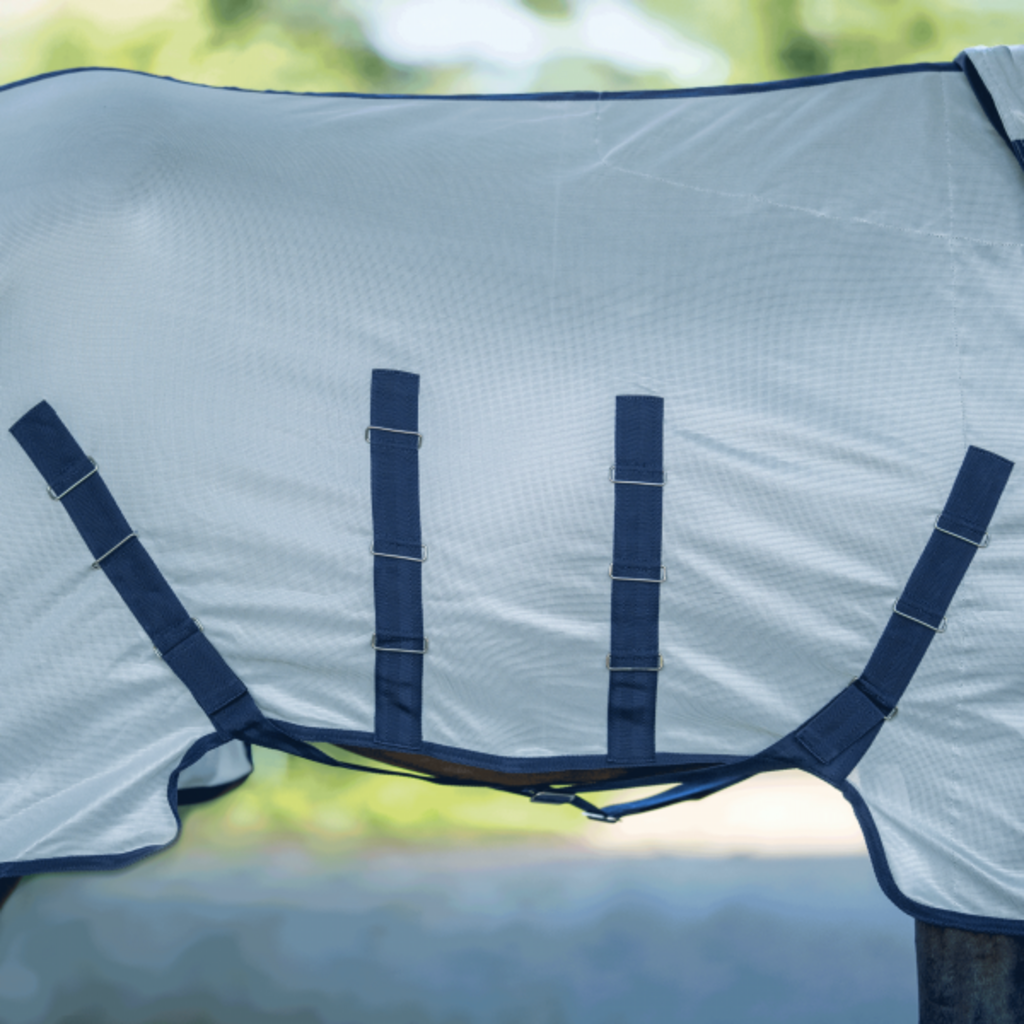 I den nedre delen ger ett luftigt nätmaterial god ventilation så att hästen inte blir för varm under varma dagar. Tack vare generösa rörelseveck får din häst stor rörelsefrihet vid galopp eller när den rullar sig, medan det släta fodret vid bringan minskar risken för skav vid bogen.