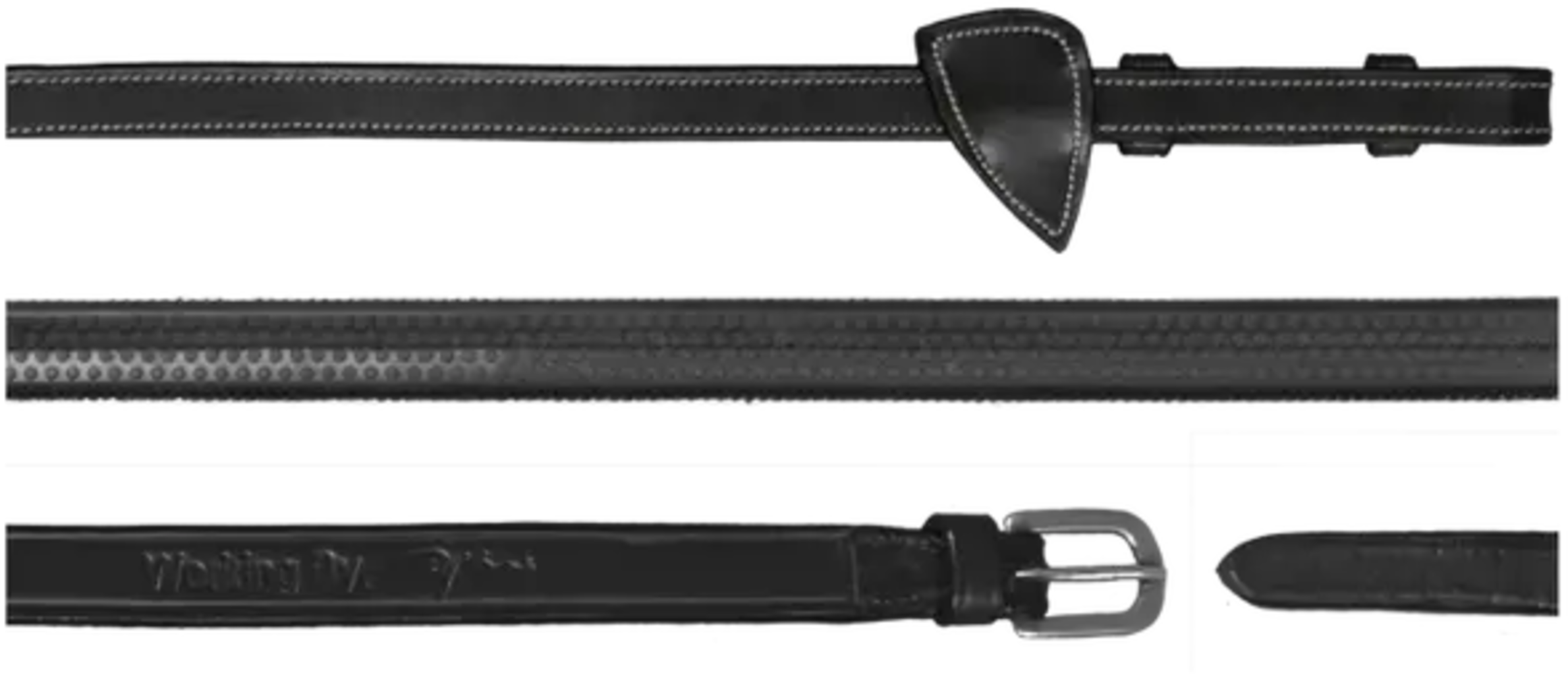 Den här högkvalitativa tygeln har ett bekvämt greppområde av nubbad gummi. Den ligger därför särskilt bekvämt och halkfritt i handen och säkerställer optimal hantering. Mittstycket och ändarna samt martingalstoppet är tillverkade av högkvalitativt läder. Ljusa sömmar och ett jämnt sömnadsmönster skapar en vacker kontrast och avrundar tyglarna på ett vackert sätt!