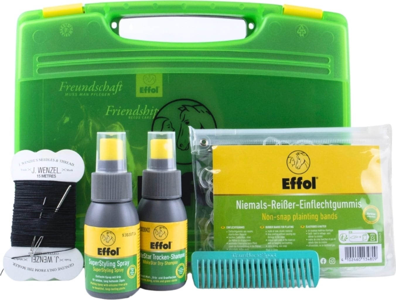 I denna robusta väska hittar du allt du behöver för professionella flätor och ett snyggt resultat - från torrschampo för envisa fläckar till specialanpassat flätgarn och matchande nålar. Allt är tydligt organiserat och säkert förvarat, så att du även i stressiga tävlingsögonblick alltid har rätt verktyg nära till hands. Med detta set blir skötseln en avkopplande rutin och du ser till att din häst gör ett starkt intryck redan från första stund.