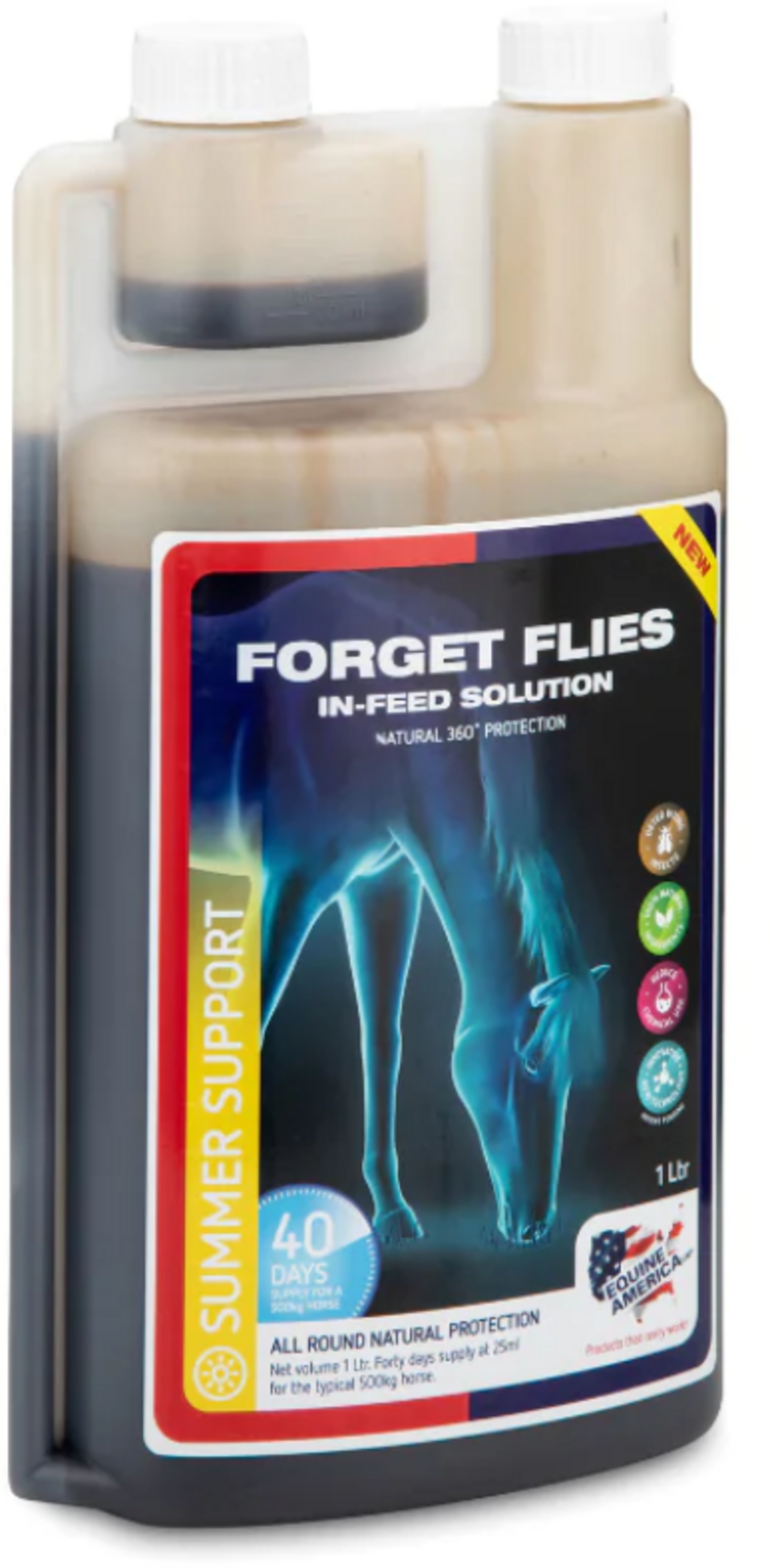 Forget Flies In-Feed Solution bygger på en särskild teknologi med naturliga ingredienser som enkelt blandas i det dagliga fodret. Kärnan i formulan är standardiserade polysulfider från vitlök. Dessa organiska föreningar tas upp via matsmältningen och transporteras genom blodkärlssystemet till hudens yta. Där avges de som flyktiga organiska ämnen och ger ett naturligt stöd under insektsrika sommarmånader.