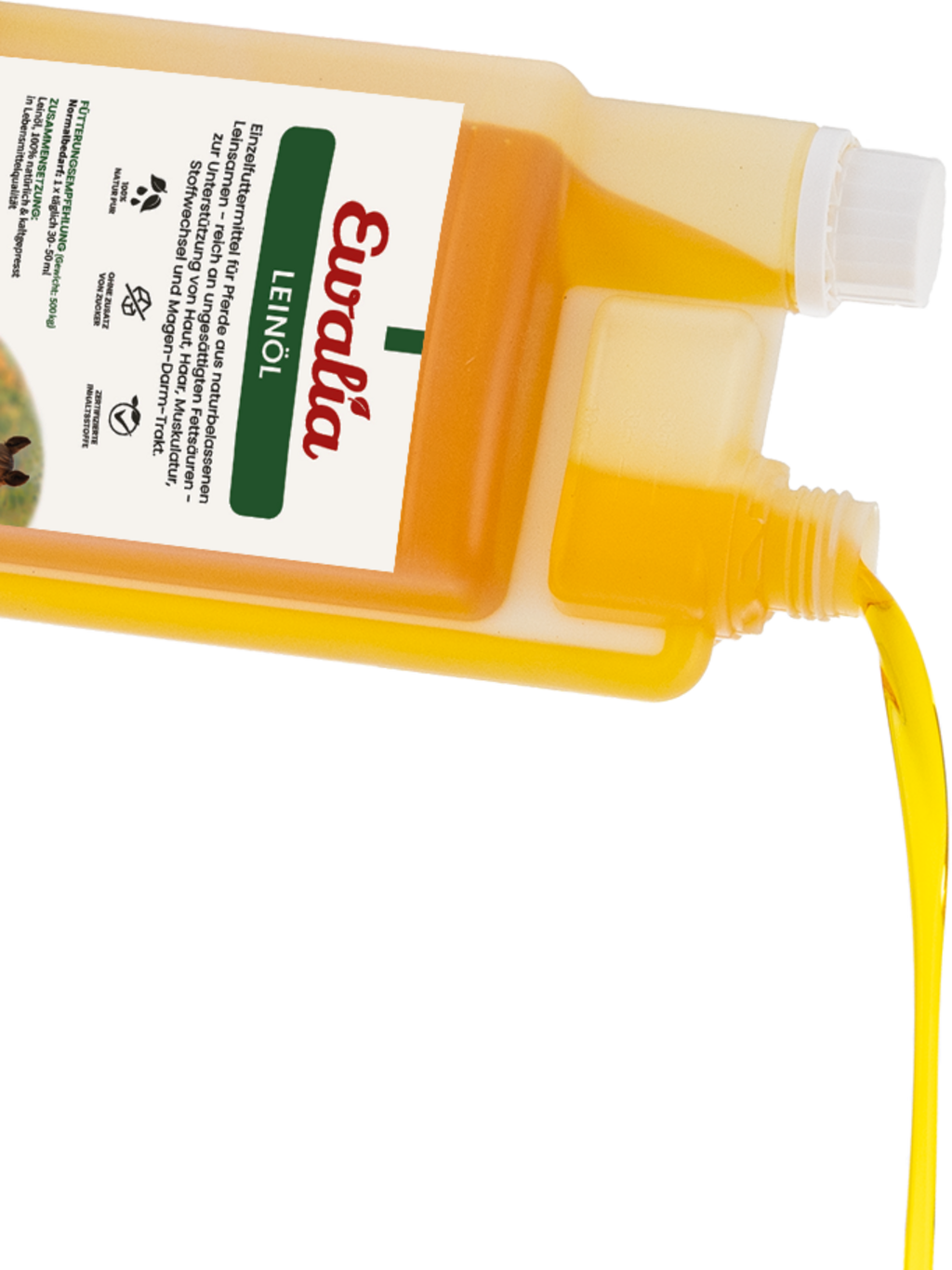 Vår 100% naturliga linolja har ett bra förhållande mellan omega-3 och omega-6-fettsyror. Så stöder den huden, håret, musklerna, ämnesomsättningen och magens tarmen. Andelen eteriska oljor i linolja är mycket liten så den är lämplig som fodertillskott för dräktiga och ammande ston. Vår kallpressade linolja i exceptionell livsmedelskvalitet ger en naturlig förbättring av det dagliga foderet.