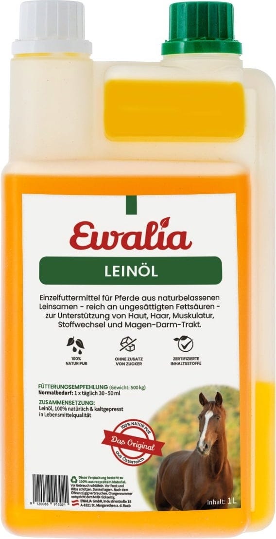 Vår 100% naturliga linolja har ett bra förhållande mellan omega-3 och omega-6-fettsyror. Så stöder den huden, håret, musklerna, ämnesomsättningen och magens tarmen. Andelen eteriska oljor i linolja är mycket liten så den är lämplig som fodertillskott för dräktiga och ammande ston. Vår kallpressade linolja i exceptionell livsmedelskvalitet ger en naturlig förbättring av det dagliga foderet.