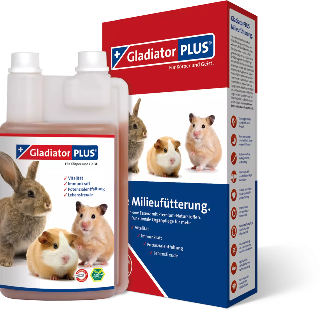 GladiatorPLUS Miljöfoder är ett särskilt biotillgängligt fodertillskott i flytande form, framtaget för smådjur.