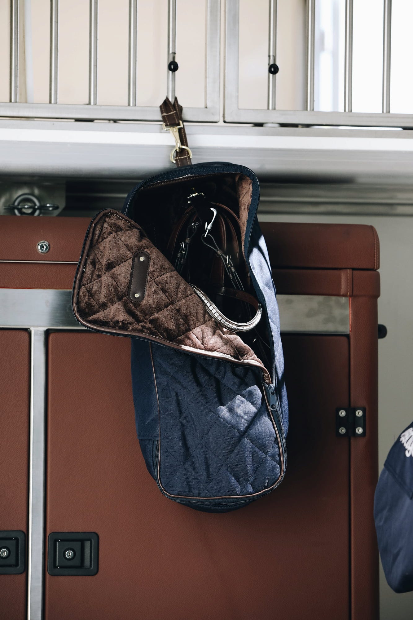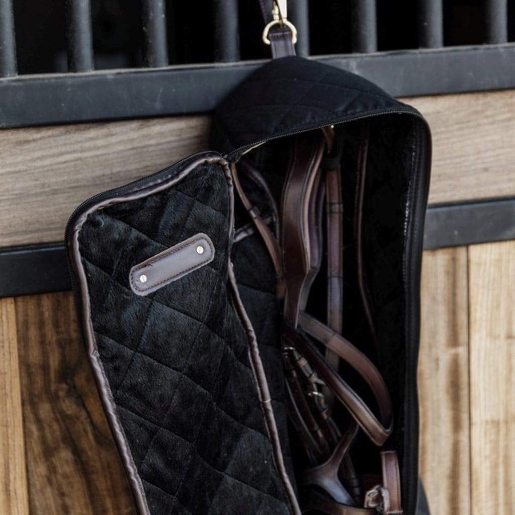 Högkvalitativ förvaring- och transportväska för träns och tyglar. Konstgjord kaninpäls på väskans insida ger optimalt skydd utan att repa det högkvalitativa lädret. Den quiltade utsidan har ett sofistikerat utseende och är utsmyckad med en elegant logoplatta. Metallfliken kan vändas när som helst och förses med din egen gravyr. Utrustad med en praktisk flik för upphängning.