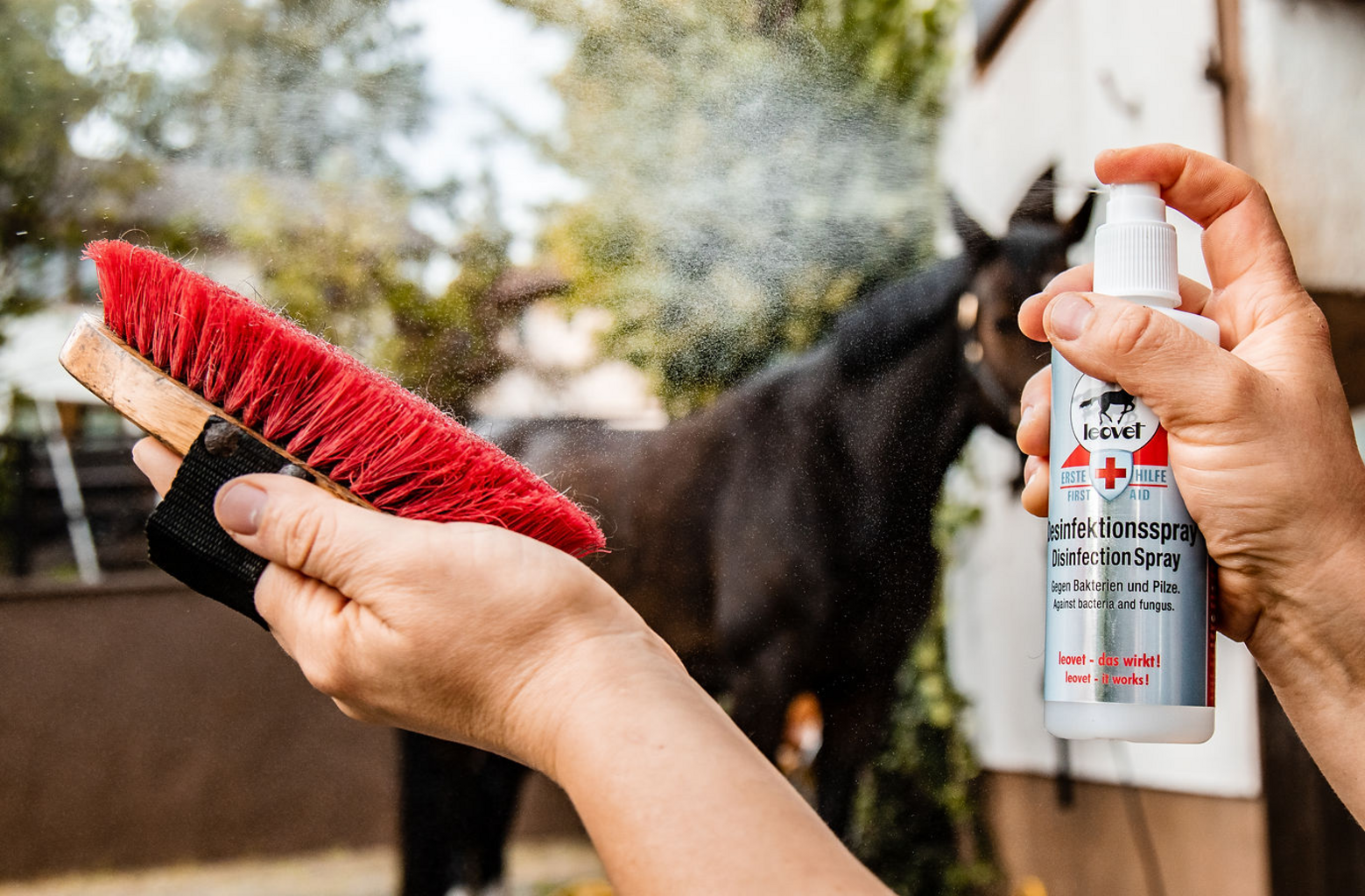 Desinfektionssprayen garanterar att patogena mikroorganismer som kan infektera människor och djur förstörs. Den är färglös, desinficerar fullständigt och verkar intensivt på kort tid. Desinfektionssprayen är en oumbärlig produkt för säker ytdesinfektion, t.ex. i stallar.