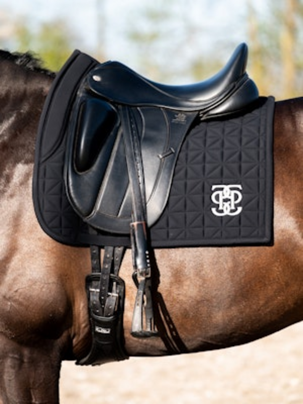 Det symmetriska diamantmönstret och det kontrasterande PS-monogrammet ger en elegant finish, medan det personliga citatet längs ryggraden ger schabraket den unika PS-känslan. Perfekt för både vardagsbruk och tävling.