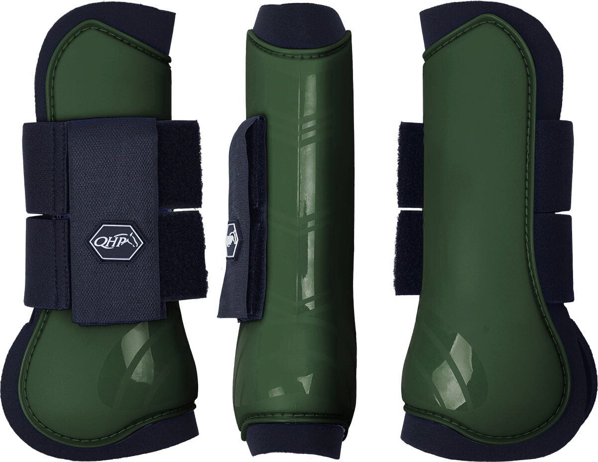 Detta set med två anatomiskt formade hårdskalade benskydd i sportigt grönt är perfekt för att skydda din hästs ben under träning och tävling.