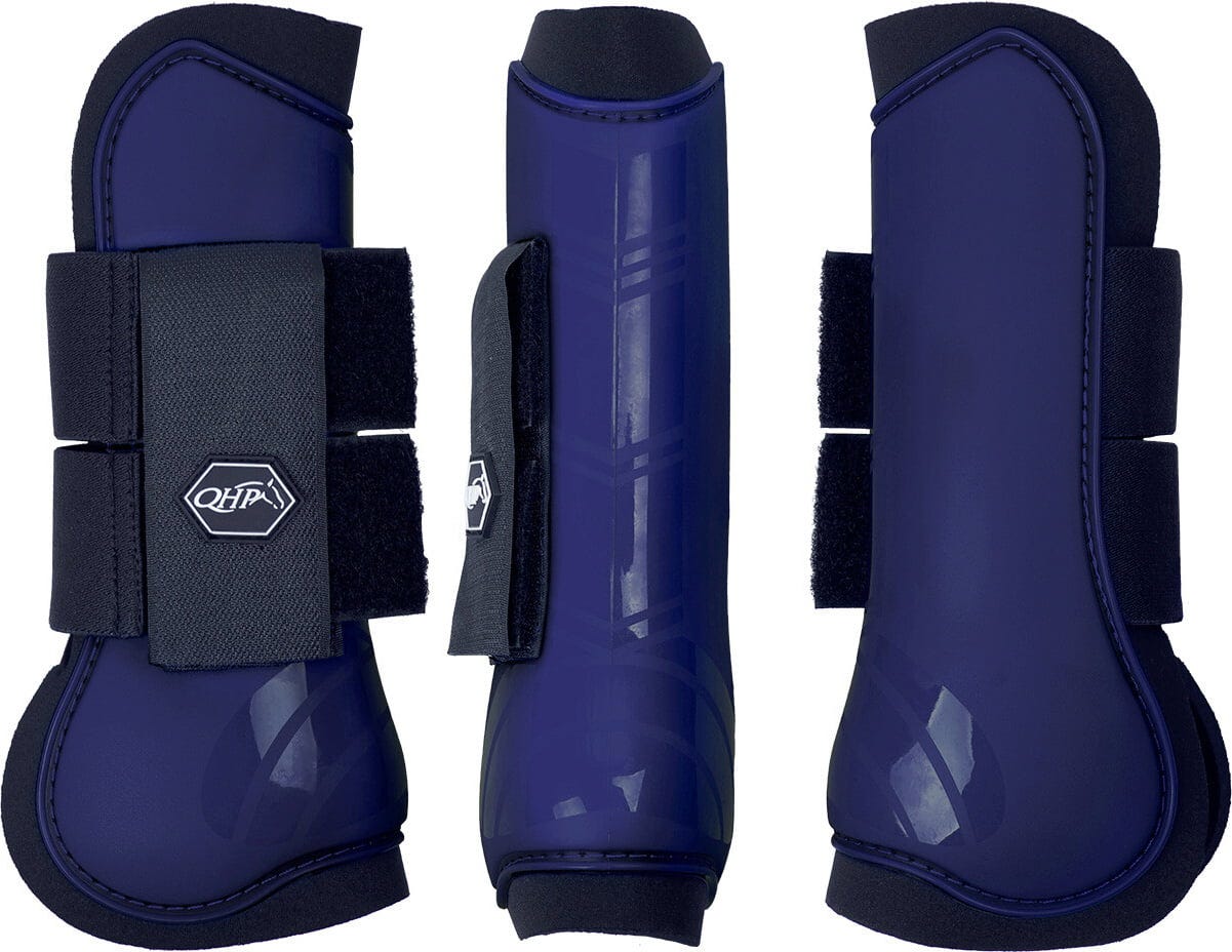 Detta set med två anatomiskt formade hårdskalade benskydd i klassisk marinblå färg är perfekt för att skydda din hästs ben under träning och tävling.