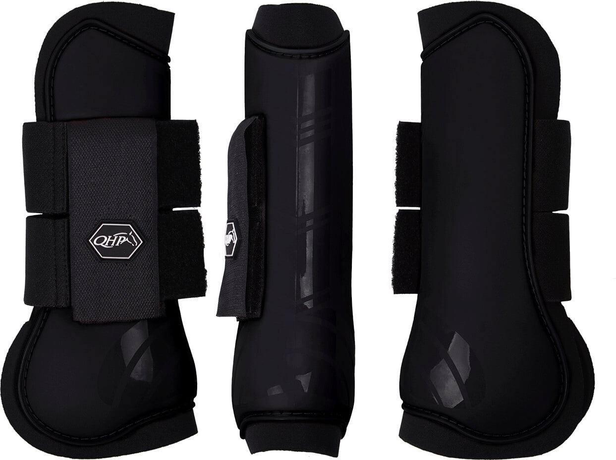 Detta set med två anatomiskt formade hårdskalade benskydd i elegant svart är perfekt för att skydda din hästs ben under träning och tävling.