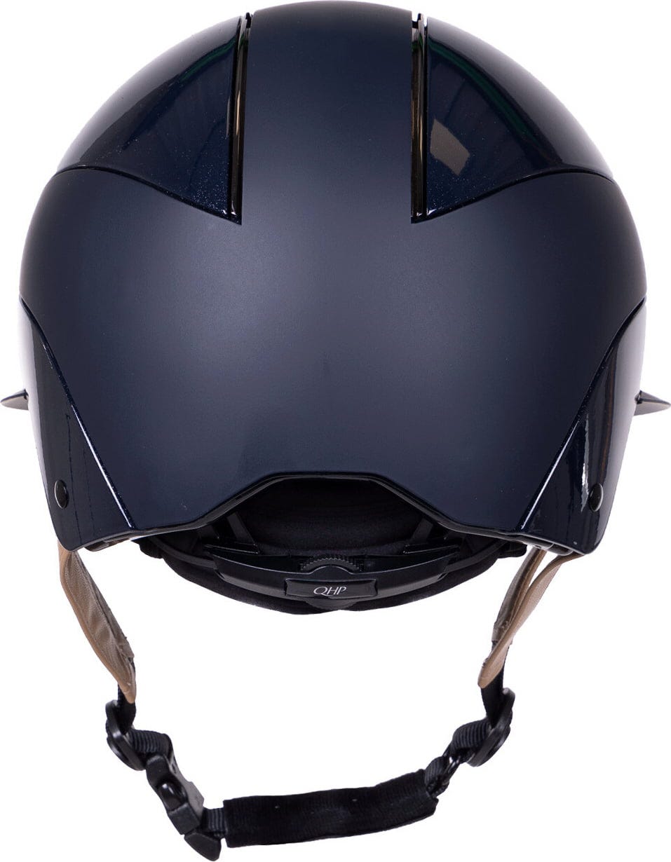 Denna iögonfallande ridhjälm från QHP är det perfekta valet för dig som vill ha både stil och komfort. Hjälmens ytterskal har en elegant matt finish med lätt glittrande effekt som är en riktig blickfångare! Det exklusiva polovisiret ger inte bara ett lyxigt uttryck utan också bättre skydd mot solen.