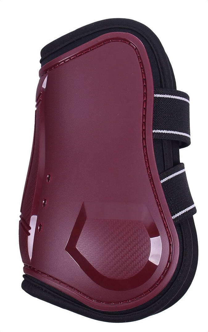 Dessa sportiga strykkappor i elegant bordeaux skyddar effektivt hästens kotleder mot slag och stötar. De omsluter området runt kotorna säkert och minskar risken för skador vid träning och tävling.