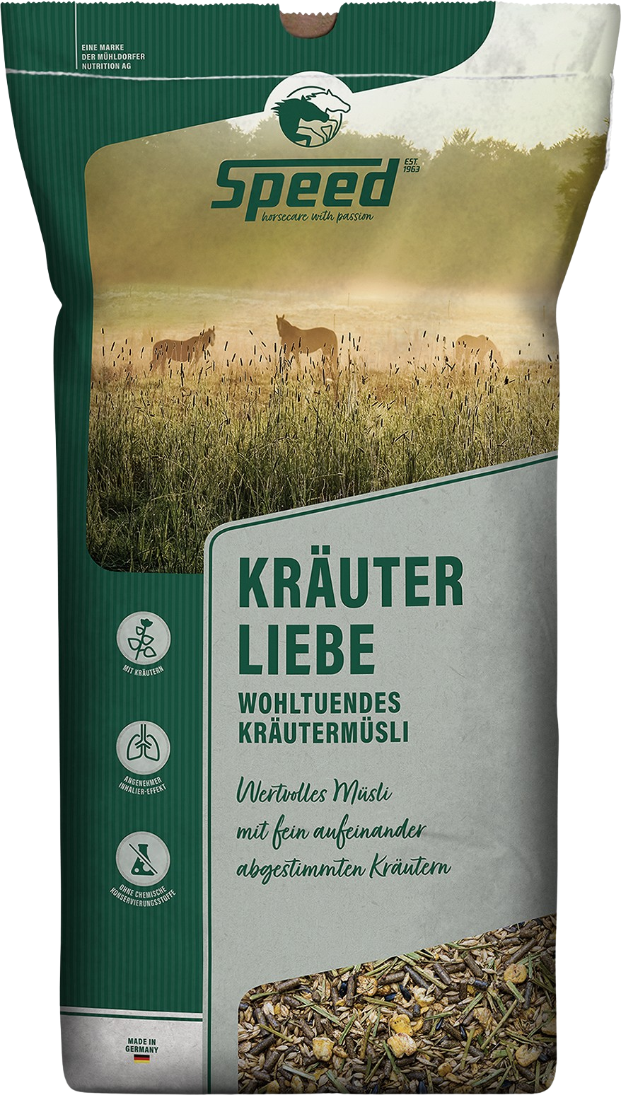 Med SPEED Kräuterliebe får du ett genomtänkt tillskott till din hästs dagliga fodergiva. Blandningen kombinerar skonsamt bearbetade fullkornsspannmål med noggrant utvalda örter samt en balanserad sammansättning av vitaminer, mineraler och spårämnen. Det ger en näringsrik och variationsrik foderlösning som enkelt integreras i din befintliga foderplan.
