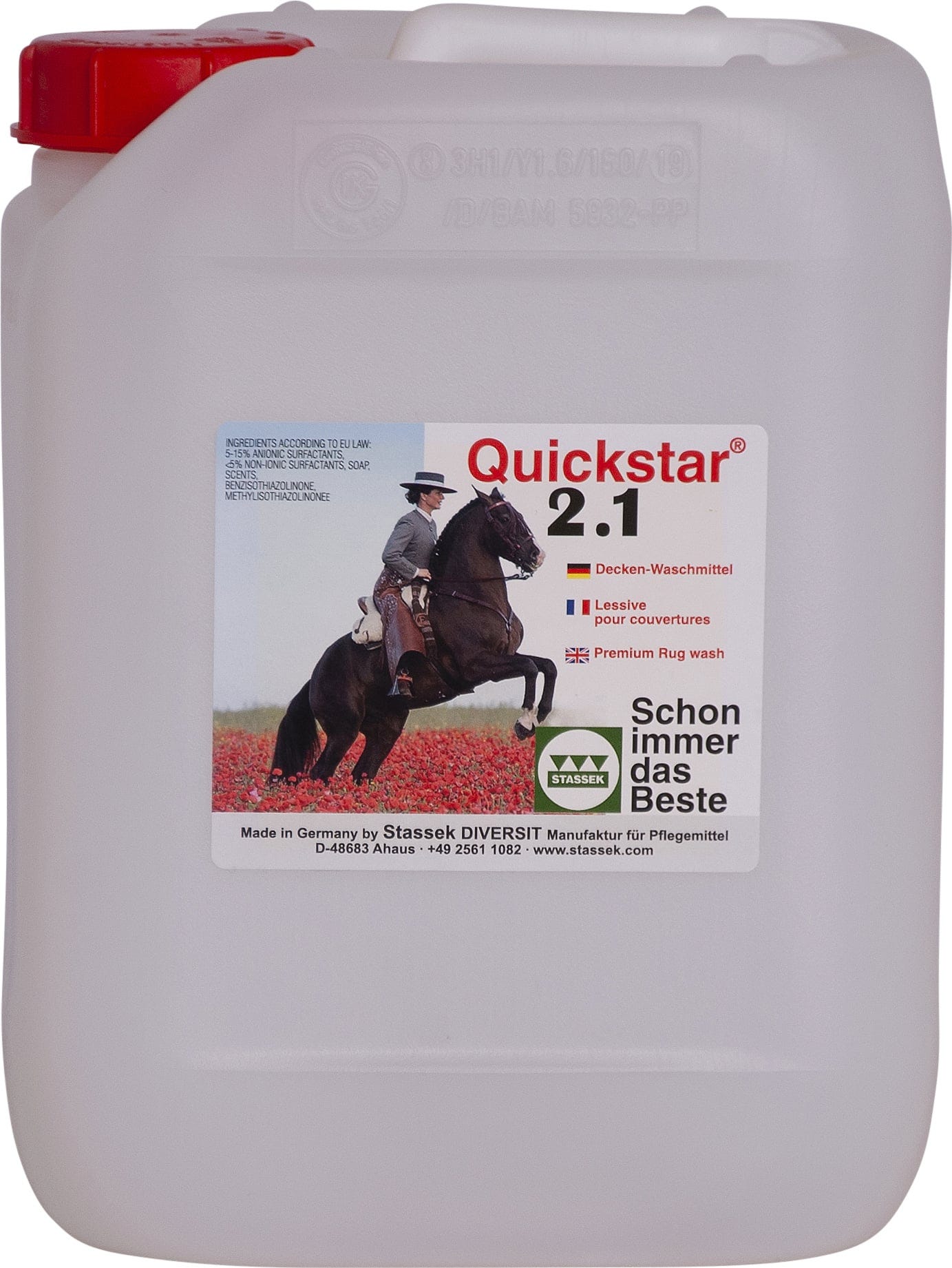 Baserat på vår Quickstar, som är beprövad och testad i många år, har vi tagit fram ett speciellt tvättmedel för hästtäcken med speciellt vattentätande skydd. Konventionella kraftiga tvättmedel och sköljmedel kan permanent förstöra hästtäckens vattenavvisande egenskaper. Quickstar 2.1 håller sig tätt.