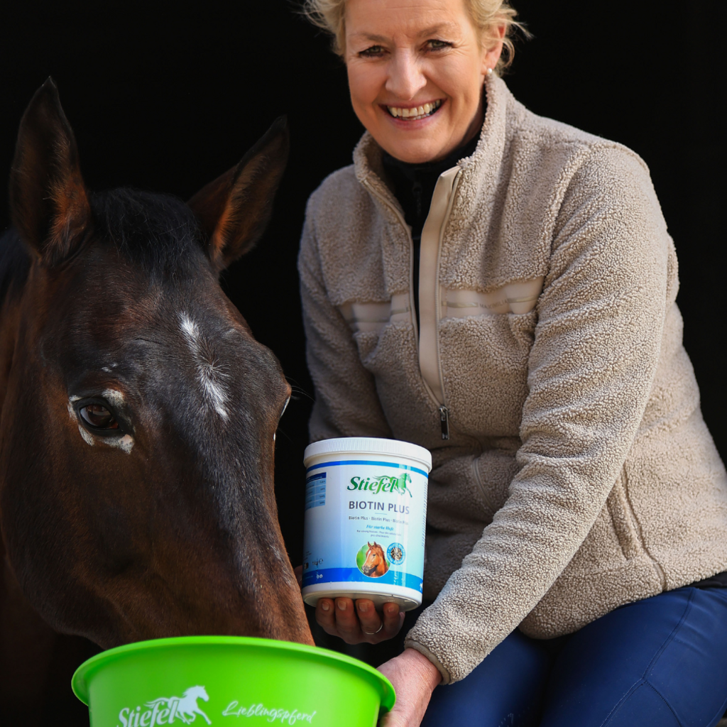 Stiefel Biotin Plus Pellet utfodras till hästar som lider av biotinbrist och kan bidra till att förbättra kvaliteten på hästens hovar och horn tack vare sin effektiva trippelformel av biotin, metionin och zink. Om hästen lider av biotinbrist kan detta ha en negativ effekt på hov- och horntillväxten samt på deras elasticitet och motståndskraft. Dessutom kan pälskvaliteten påverkas: Det kan leda till flagnande päls och hudirritationer.
