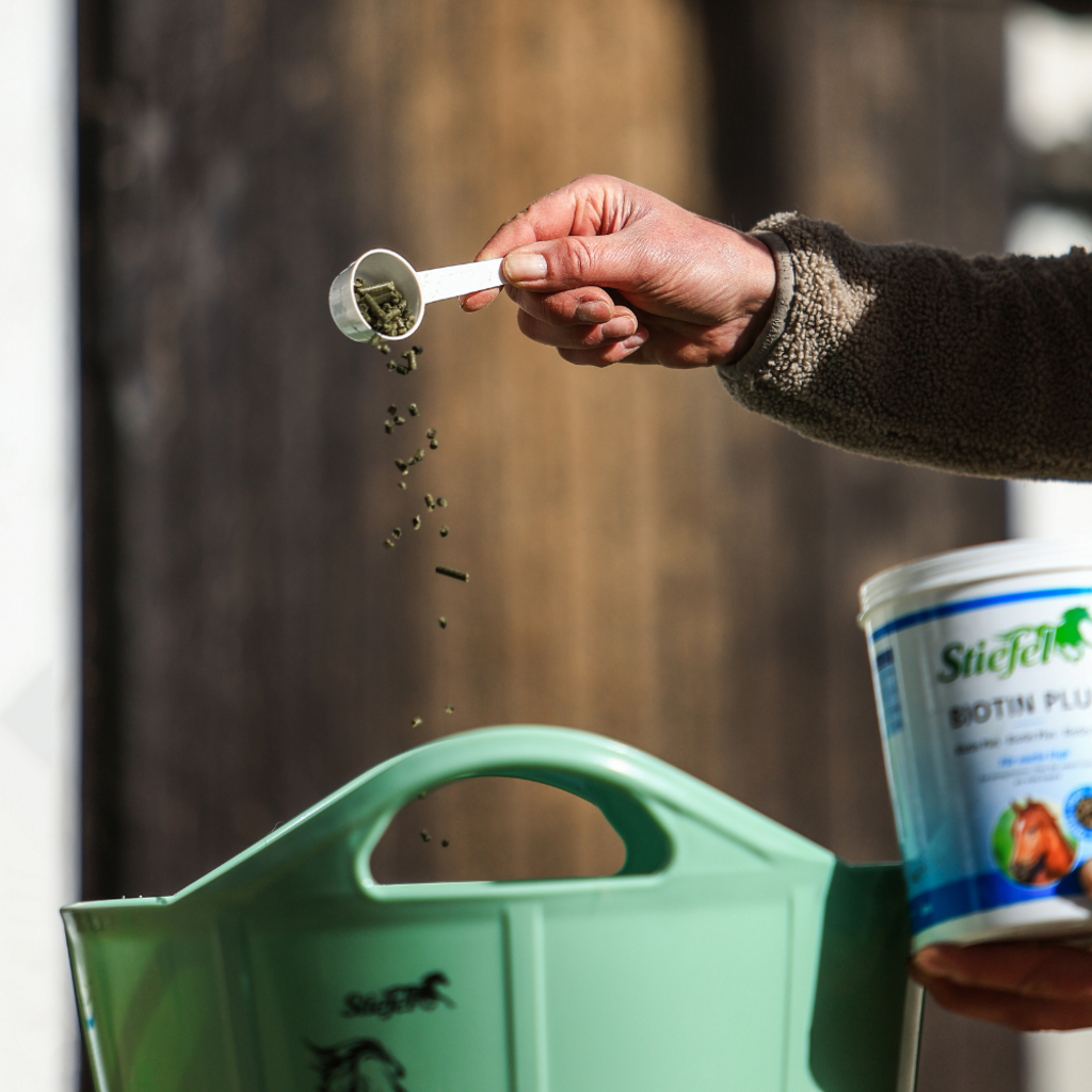 Obs: Utfodring av Stiefel Biotin Plus bör ske under en längre tidsperiod, men minst 9 månader, eftersom biotin först kan bli märkbart när nya hornceller växer. I genomsnitt växer klöven 1 cm per månad.