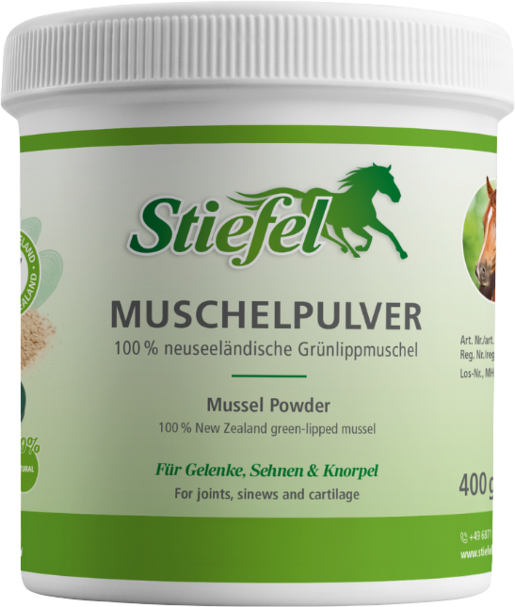 Stiefel musselpulver är en ren naturprodukt. Pulvret består av 100% nyzeeländska grönläppade musslor. Stiefel musselpulver kan stödja hästens hela rörelseapparat och främja en hälsosam rörelse tack vare de viktiga glykosaminoglykaner och fleromättade fettsyror det innehåller. Bindväven kan stärkas och ledfunktionen förbättras.