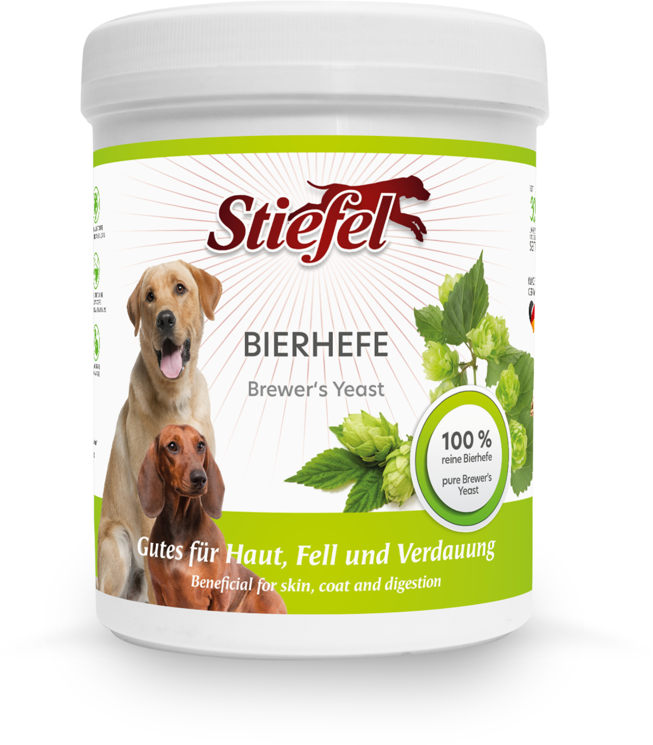 Stiefel bryggerijäst kan, tack vare de naturligt förekommande B-vitaminerna i jäst, bidra till att stödja en normal matsmältning och hundens ämnesomsättning. Detta gör bryggerijäst särskilt lämplig under perioder av pälsfällning. För denna produkt används 100 % bryggerijäst som finmals för att säkerställa hög acceptans och ett så enkelt upptag via fodret som möjligt.