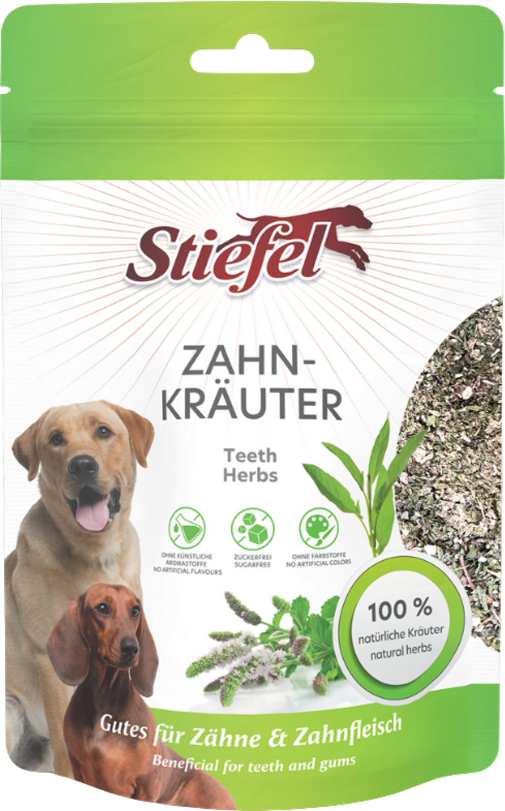 Stiefel tandörter innehåller en naturlig sammansättning av noggrant utvalda örter som salvia och pepparmynta för att på ett naturligt sätt stödja hundens tandvård.