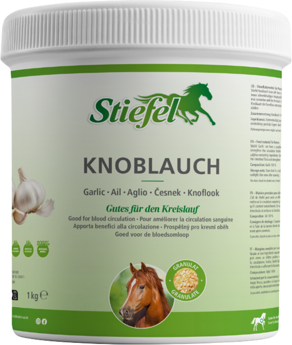 Stiefel Vitlök består av 100% rent granulat med värdefulla svavelhaltiga ingredienser som kan stärka hästens cirkulation. Stövlar Vitlök kan också hjälpa till att reglera blodsocker och blodfetter för att optimera cellmetabolismen och blodtillförseln. Stiefel Vitlök har också en positiv effekt på tarmfloran. Bildandet av matsmältningssekret stimuleras och felaktig jäsning kan minskas. Bronkialsystemet kan också dra nytta av vitlök, eftersom lungfunktionen stärks och slem kan bli bättre flytande och därmed hostas upp. Eftersom vitlök har en egen smak rekommenderas att den utfodras långsamt och att den rekommenderade dagliga mängden fördelas på flera ransoner för att öka acceptansen.