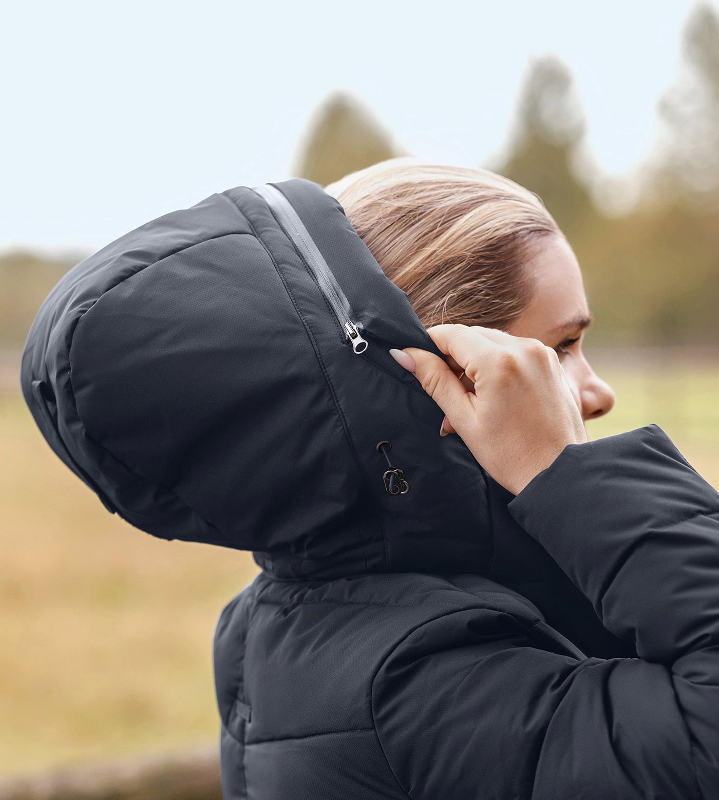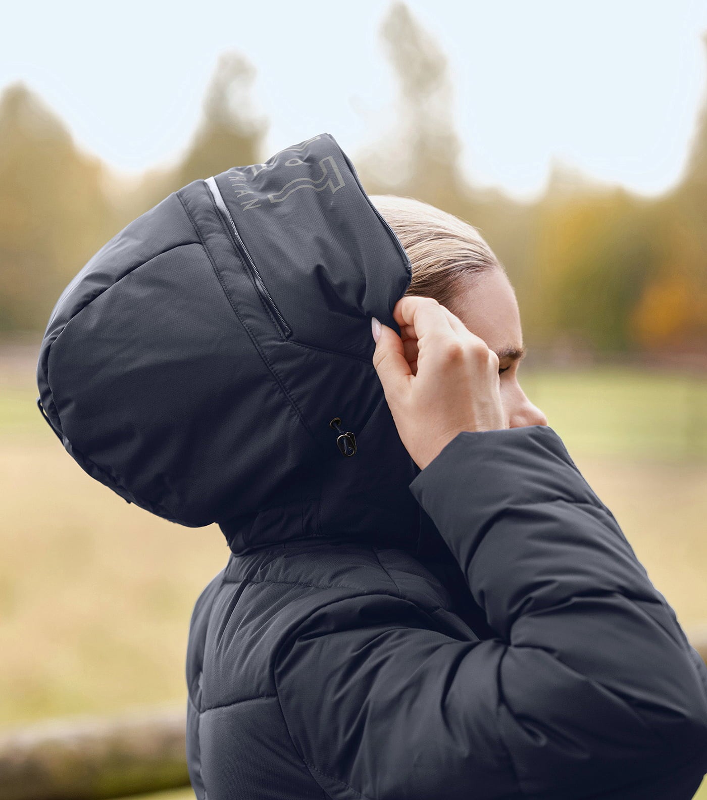 Den exklusiva 2-vägsdragkedjan i metallfinish är perfekt för ryttare: den slutar ovanför sadeln för att skydda lädret. Justerbara bensnören håller jackan på plats även i trav. Vid regn skyddar den avtagbara huvan med infällbart visir.